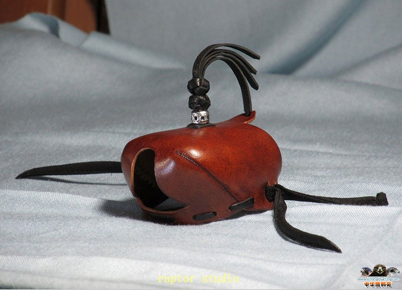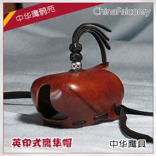 鹰帽,手工缝制而成,套在鹰隼的头部只露出猛禽的喙,遮住其眼睛使之不能看见东西。目的是让鹰隼保持安静避免奋力的飞扑碰到硬物导致损伤猛禽的飞羽和尾羽,和不必要的身体损伤。猛禽羽毛的保护是最为重要的。